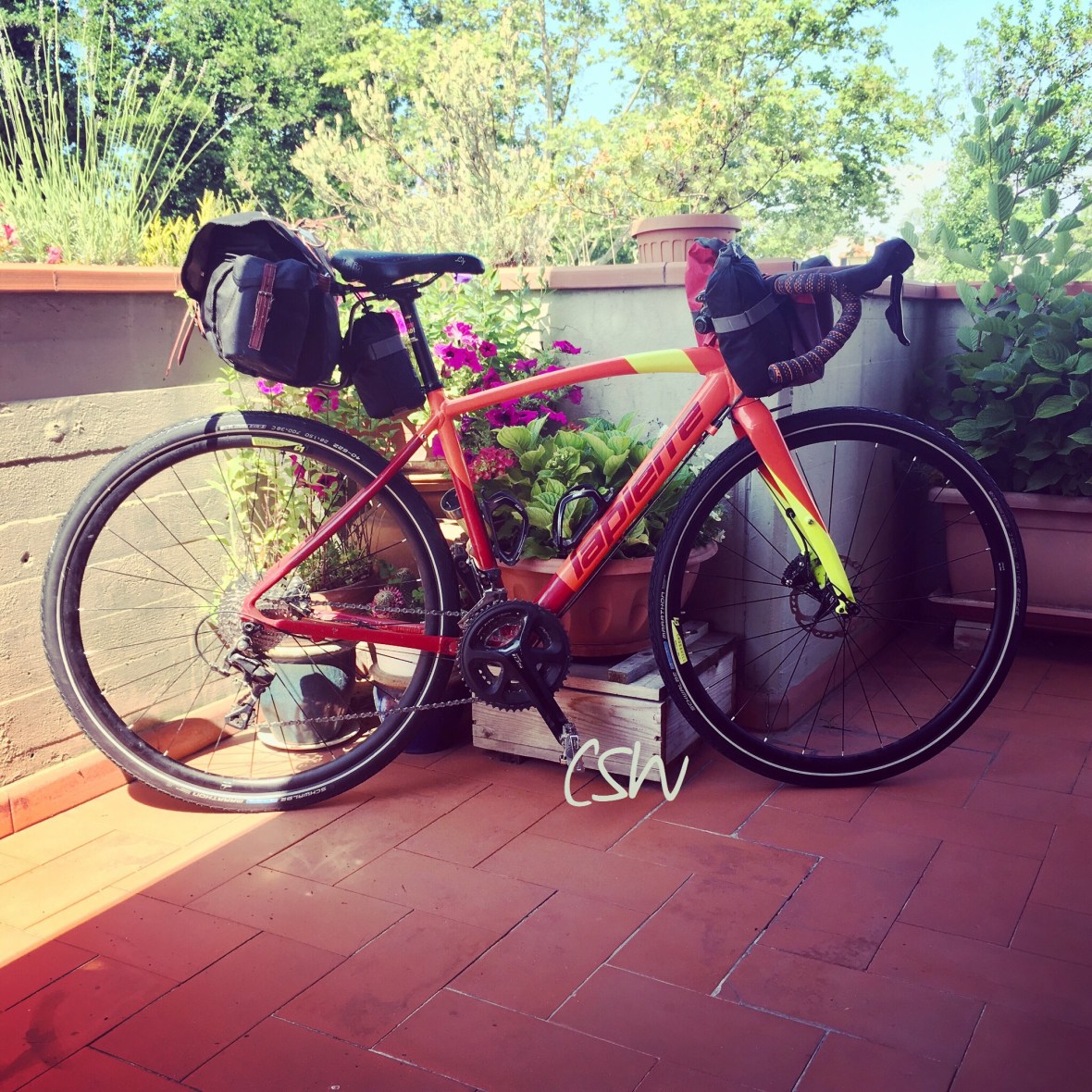My bicycle, a Lapierre Crosshill 500, is now almost packed and ready to go. I didn’t take photos of the stuff, but here is an image of the whole setup and a list: